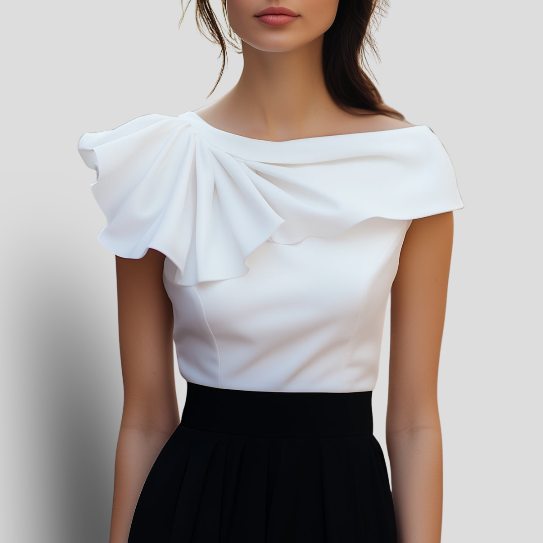AMBRE PARIS présente cette blouse chic à volant asymétrique et col bateau pour sublimer votre allure sophistiquée. Ce haut élégant combine structure et féminité grâce à son encolure bateau et son design audacieux à volant sur une seule épaule. Gracieuse et raffinée, cette blouse blanche sans manches présente un volant asymétrique qui descend de l'épaule, ajoutant une touche sculpturale délicate.