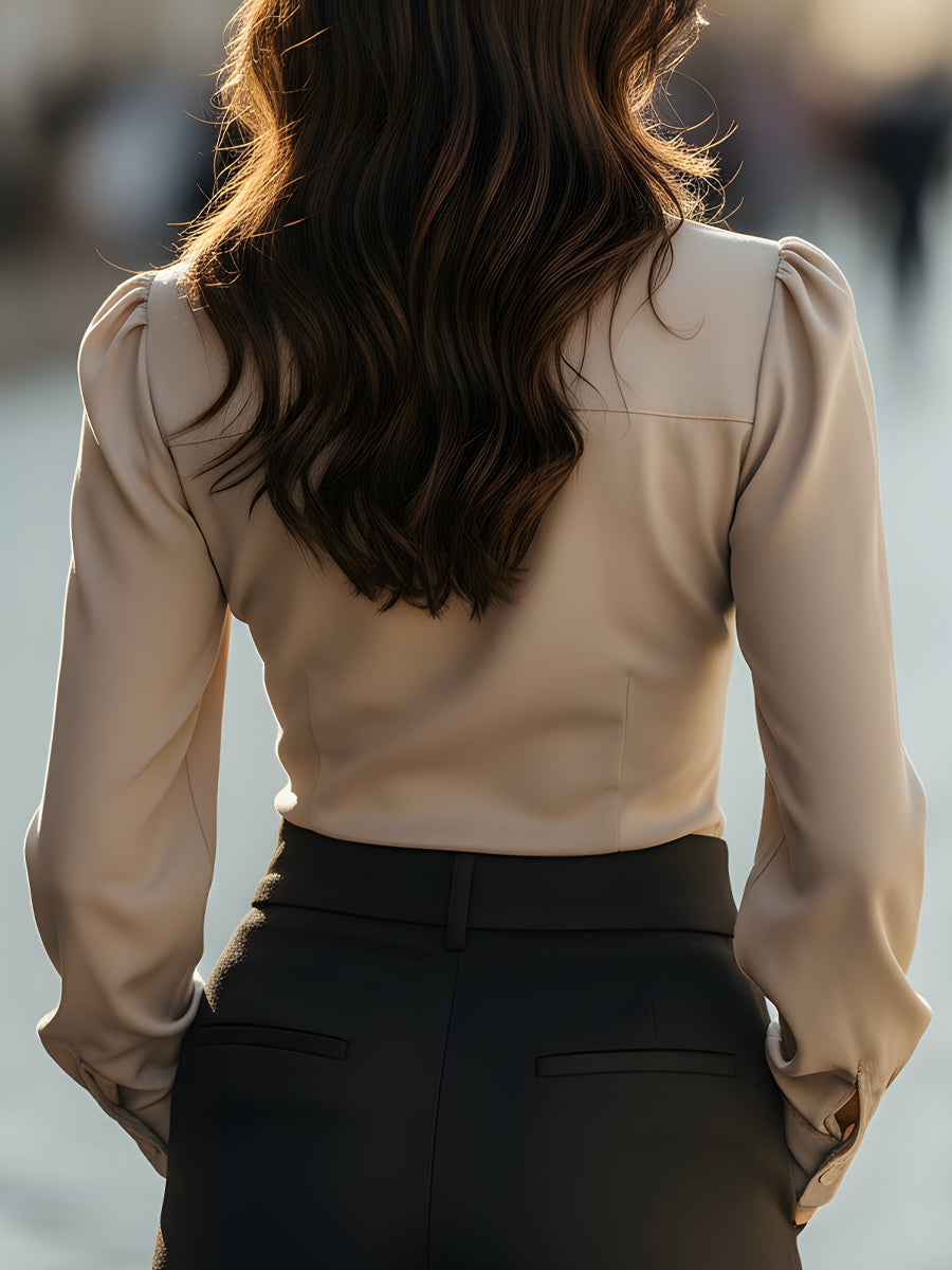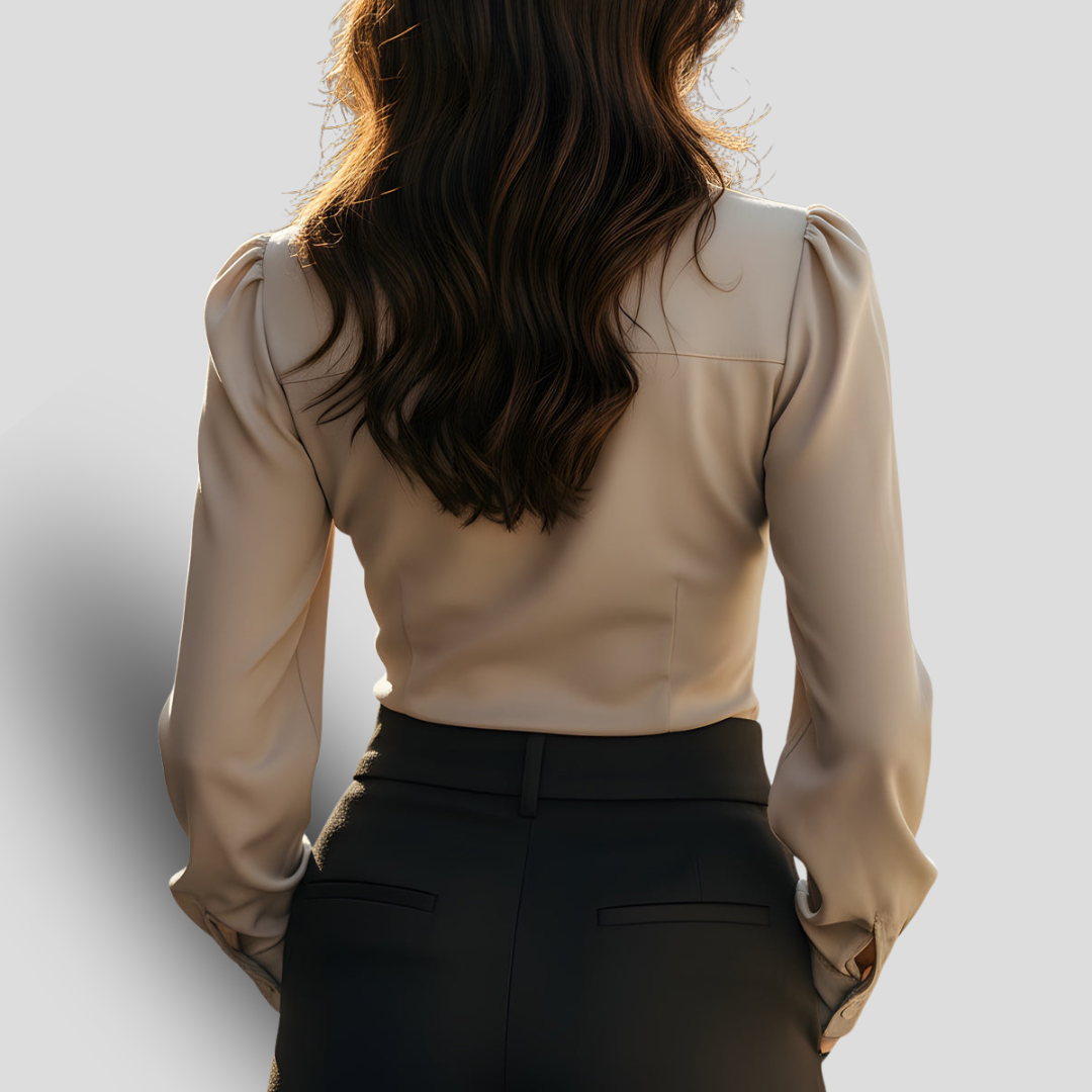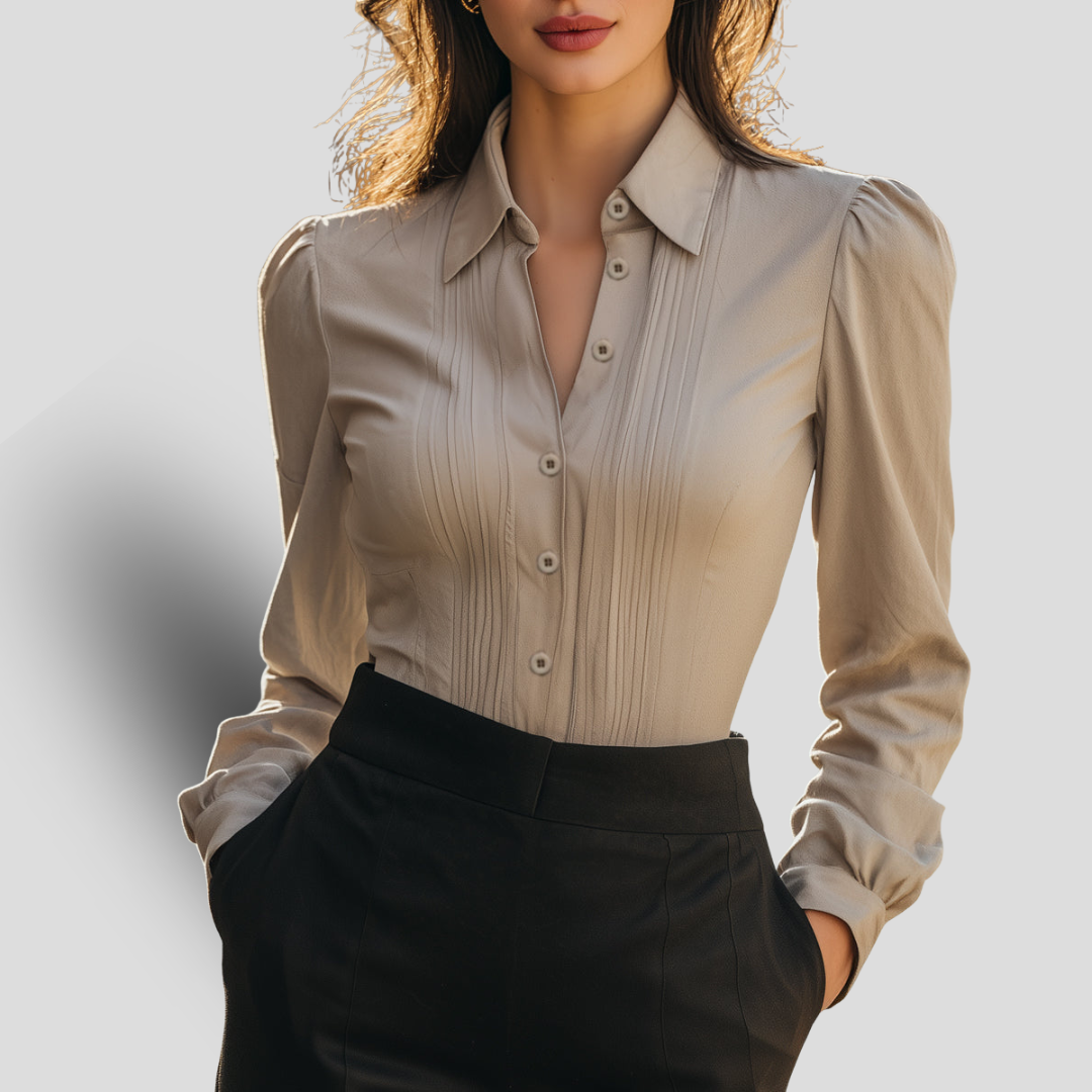 Les légers froncés aux épaules créent un contour féminin, tandis que le col de chemise classique maintient un look soigné et professionnel. Les manches longues s'affinent délicatement aux poignets, offrant une finition tailleur qui s'associe parfaitement à vos pièces préférées pour une allure impeccable du matin au soir.