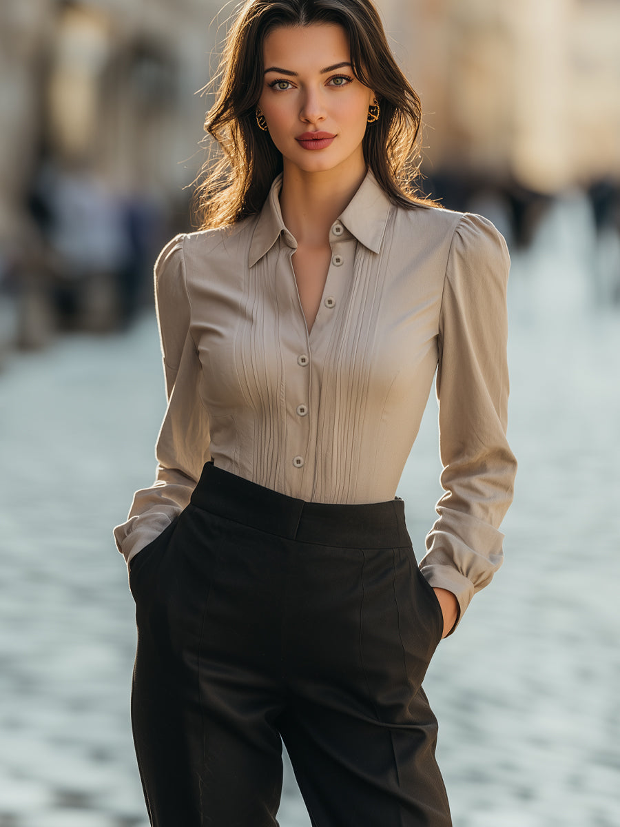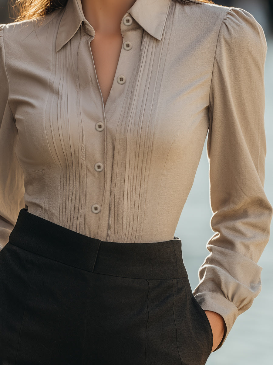 Ce chemisier incarne l'élégance discrète avec ses lignes épurées et ses détails soigneusement pensés. Confectionné dans un tissu tissé léger au drapé lisse et doux, il présente une fermeture boutonnée raffinée associée à des plis verticaux délicats qui allongent la silhouette et ajoutent une touche de sophistication immédiate.