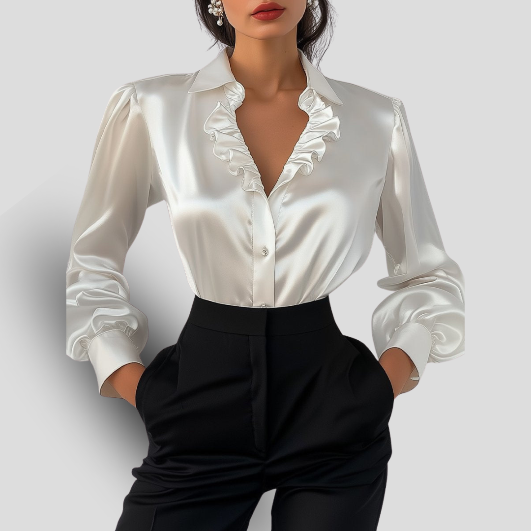 Blanc Volupté | Blouse en Satin à Encolure V Volantée