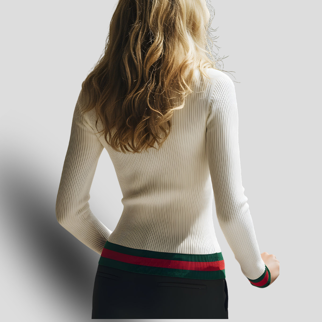 AMBRE PARIS présente ce pull en maille côtelée ivoire, un incontournable raffiné qui allie le charme parisien au minimalisme moderne. Confectionné dans une maille douce qui épouse les formes, ce modèle met la silhouette en valeur tout en offrant un confort et une élasticité exceptionnels. La base ivoire épurée est rehaussée de bordures rayées classiques vertes et rouges, ajoutant une touche de sophistication sportive à un design iconique.