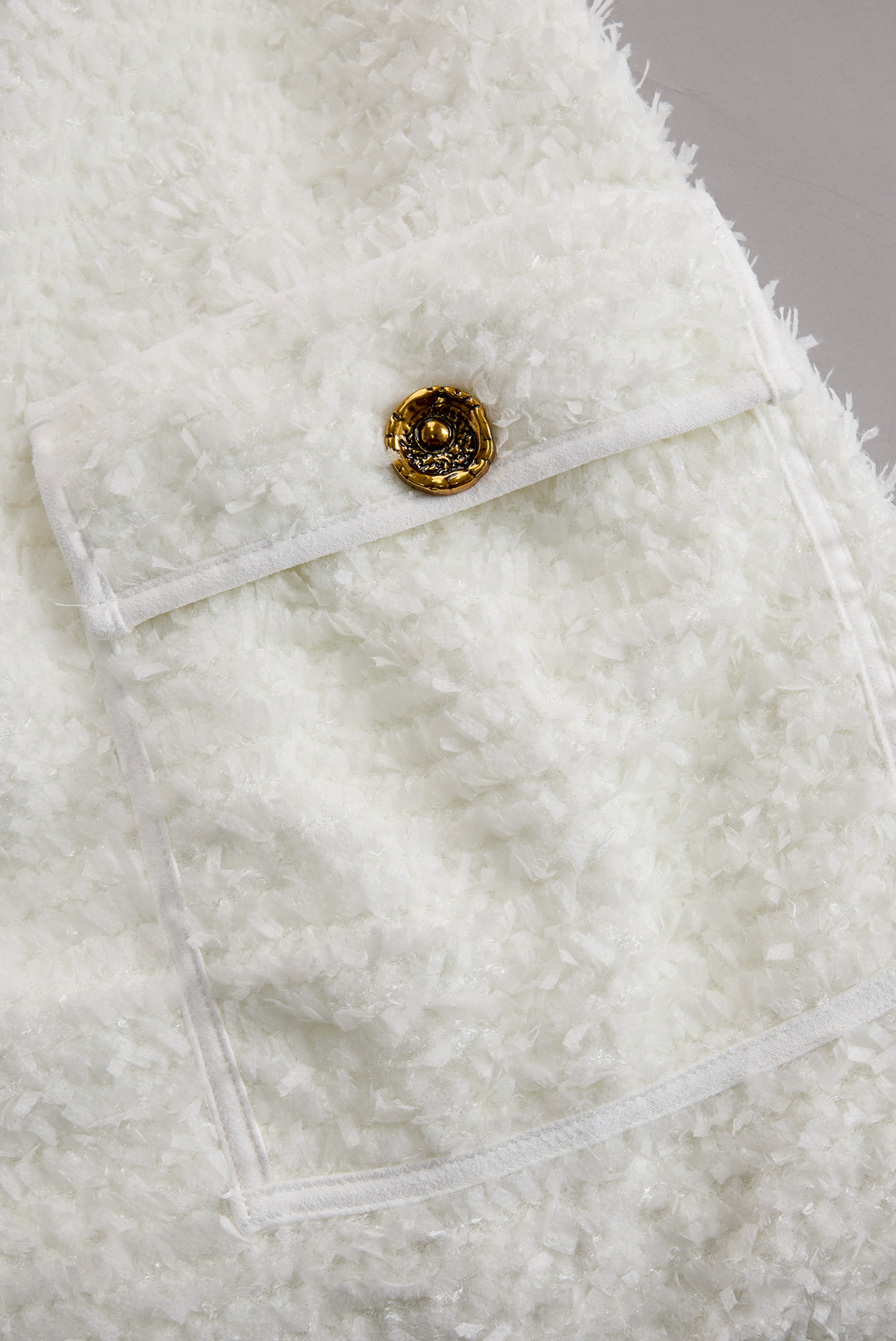 • Tissu Luxueux : Le tweed de haute qualité offre un toucher doux tout en conservant une structure impeccable, alliant confort et sophistication.