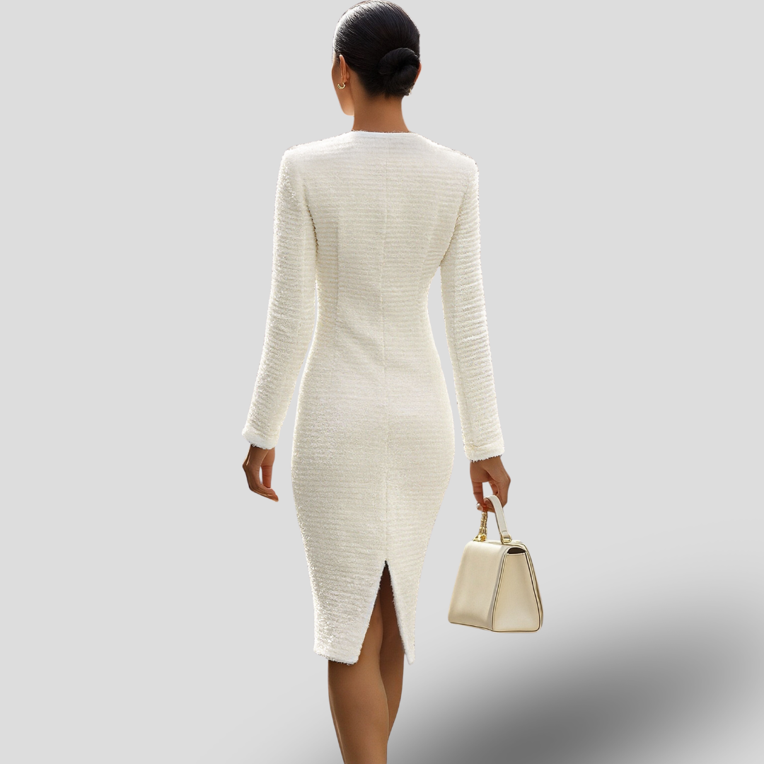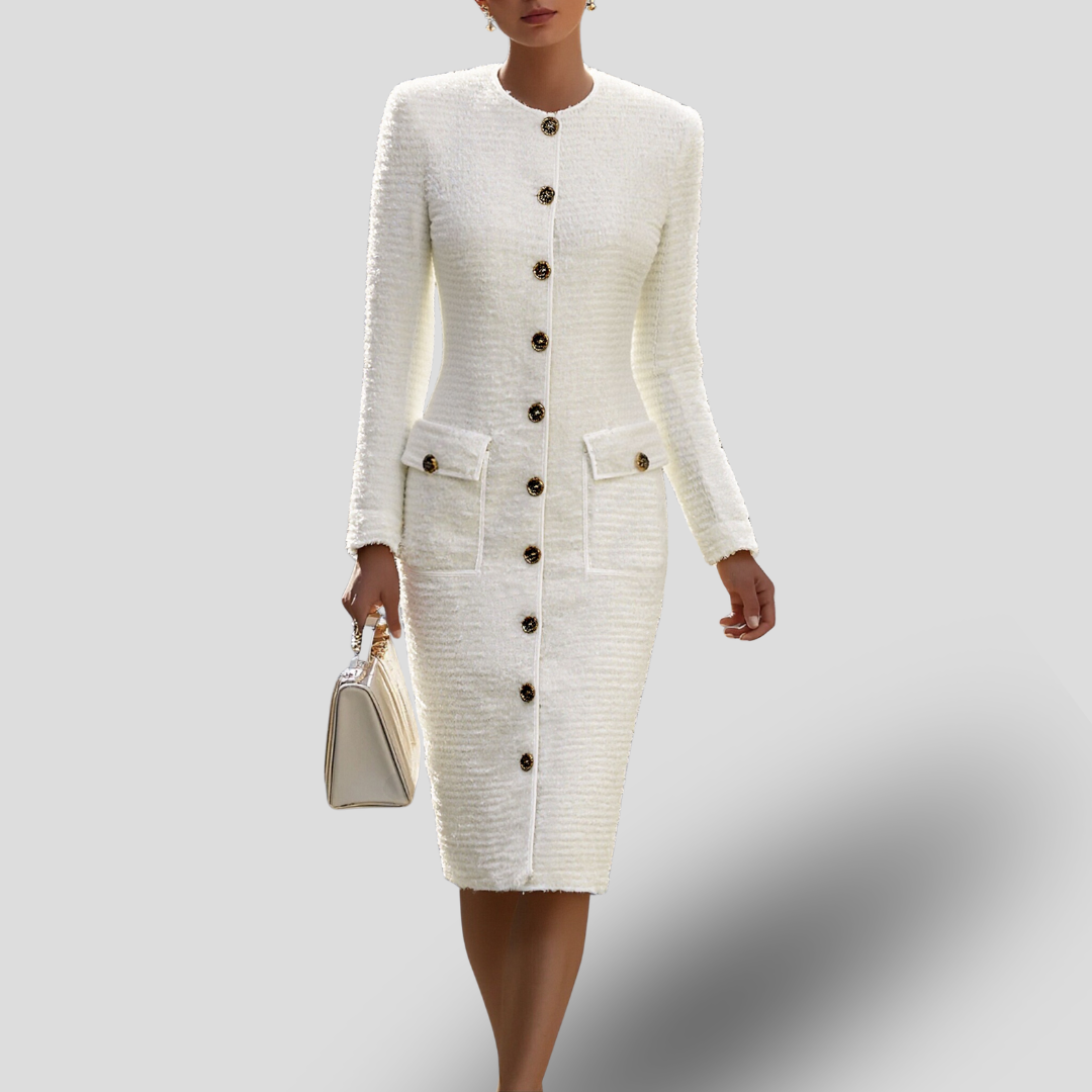 Cette robe midi raffinée en tweed ivoire allie un design classique à une élégance moderne. Arborant une coupe ajustée flatteuse, des détails de boutons dorés et une longueur genou sophistiquée, cette pièce dégage grâce et confiance. Parfaite pour le milieu professionnel, les événements formels ou les soirées chics, c'est une pièce polyvalente qui rehausse instantanément toute garde-robe.