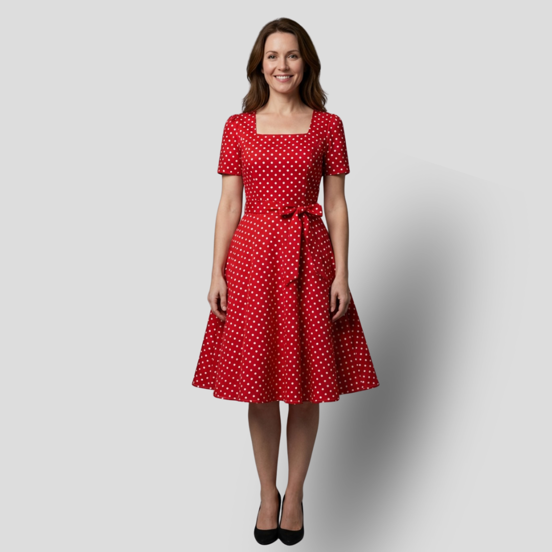 La robe Beatrix réunit charme et raffinement dans une silhouette magnifiquement fluide. Son corsage délicatement ajusté souligne la taille avec douceur, tandis que la jupe évasée apporte légèreté et aisance à chaque mouvement. Le motif à pois classique ajoute une touche de caractère d'inspiration vintage, complété par un nœud délicat qui sublime cette finition féminine. Conçue pour être aussi confortable qu'élégante, sa matière se drape avec fluidité pour accompagner naturellement vos mouvements tout au long de la journée.